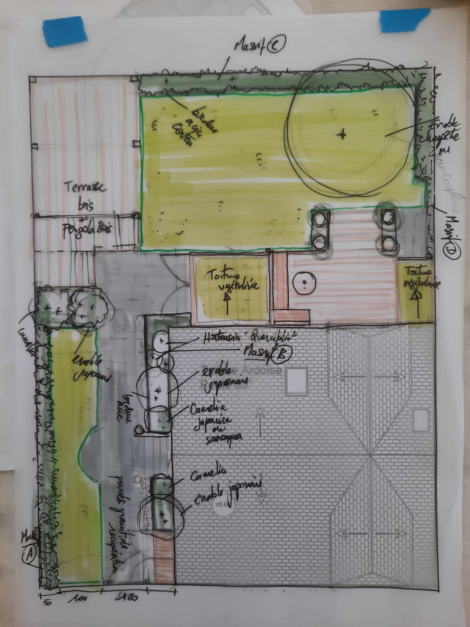 Un jardin convivial et très floral, avec arbustes ornementaux typiquement nantais ( Camélias séquanais et camélias japonica, érables japonais, magnolia de Soulange, etc. ), des arbustes champêtres d’ombres et de soleil ( cornouillers,etc.) et des massifs odorants (romarins rampants , sauges de Loire, Deuzia gracile,etc.).